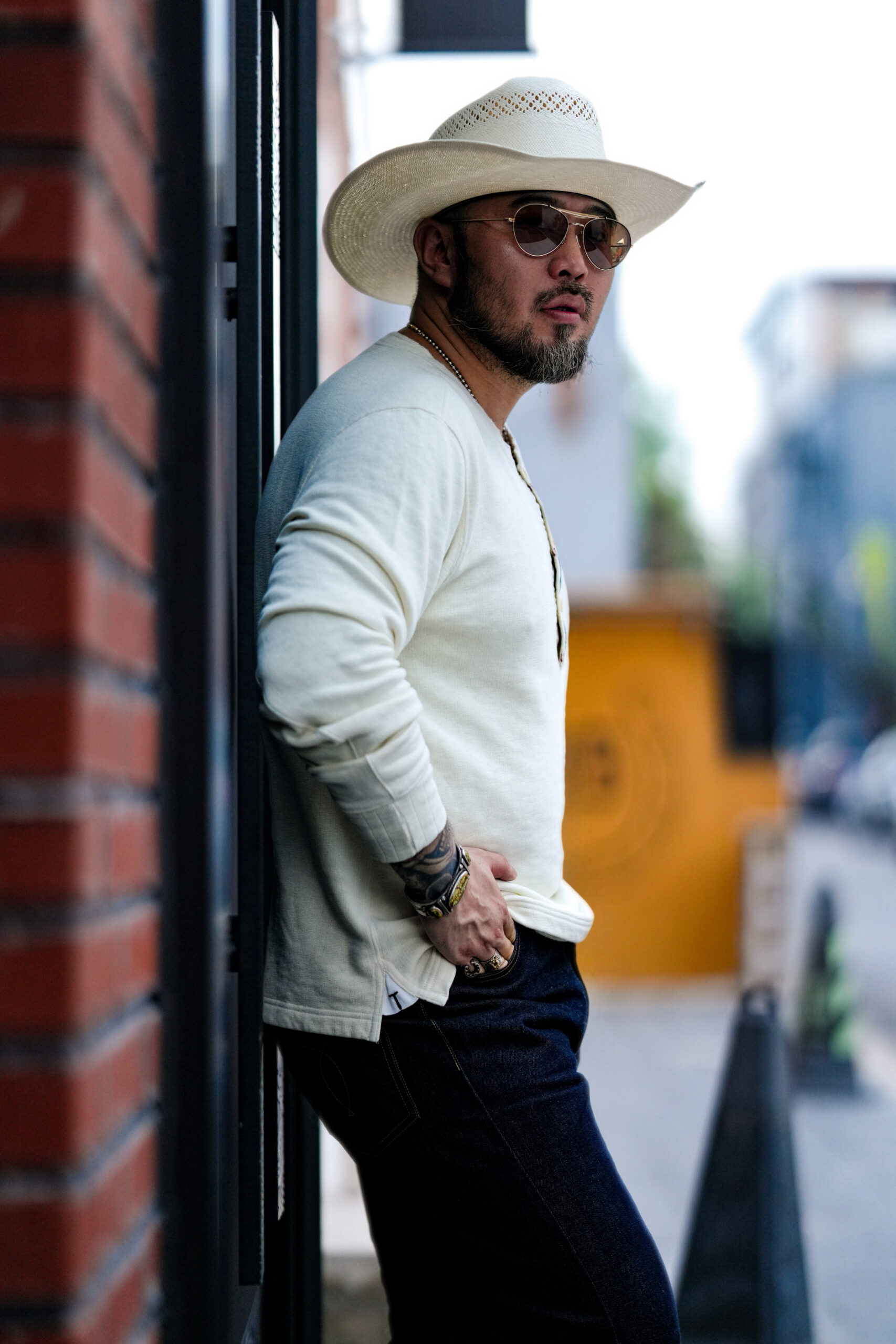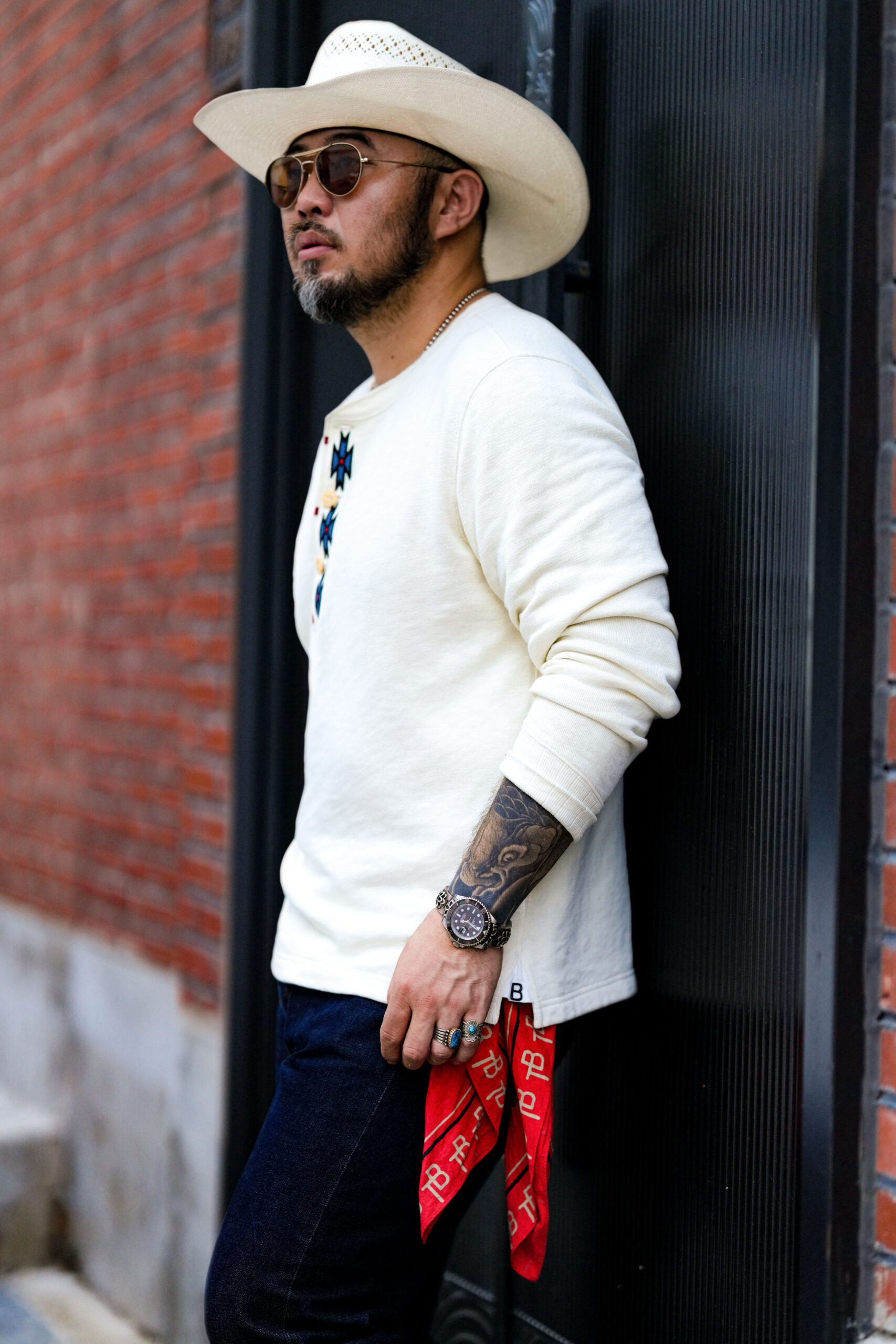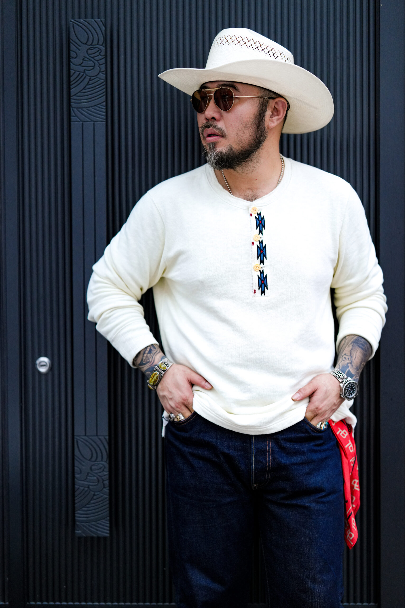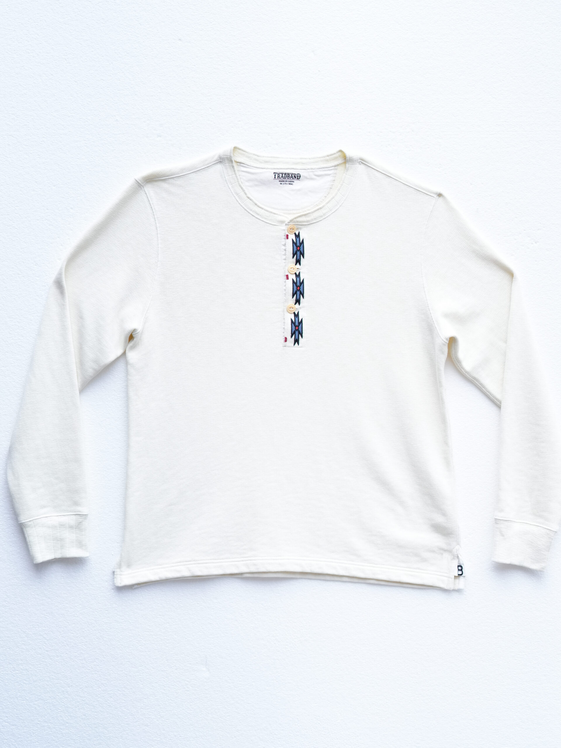 The TRAD BAND bamboo Southwestern embroidered Henley sweatshirt is now available. This off-white wash offers a vintage feel. The comfortable top features a tri-color Southwestern pattern embroidered around the neckline with red hand-embroidered accents. The hem features a split hem with the letters “T” and “B” embroidered on each side.