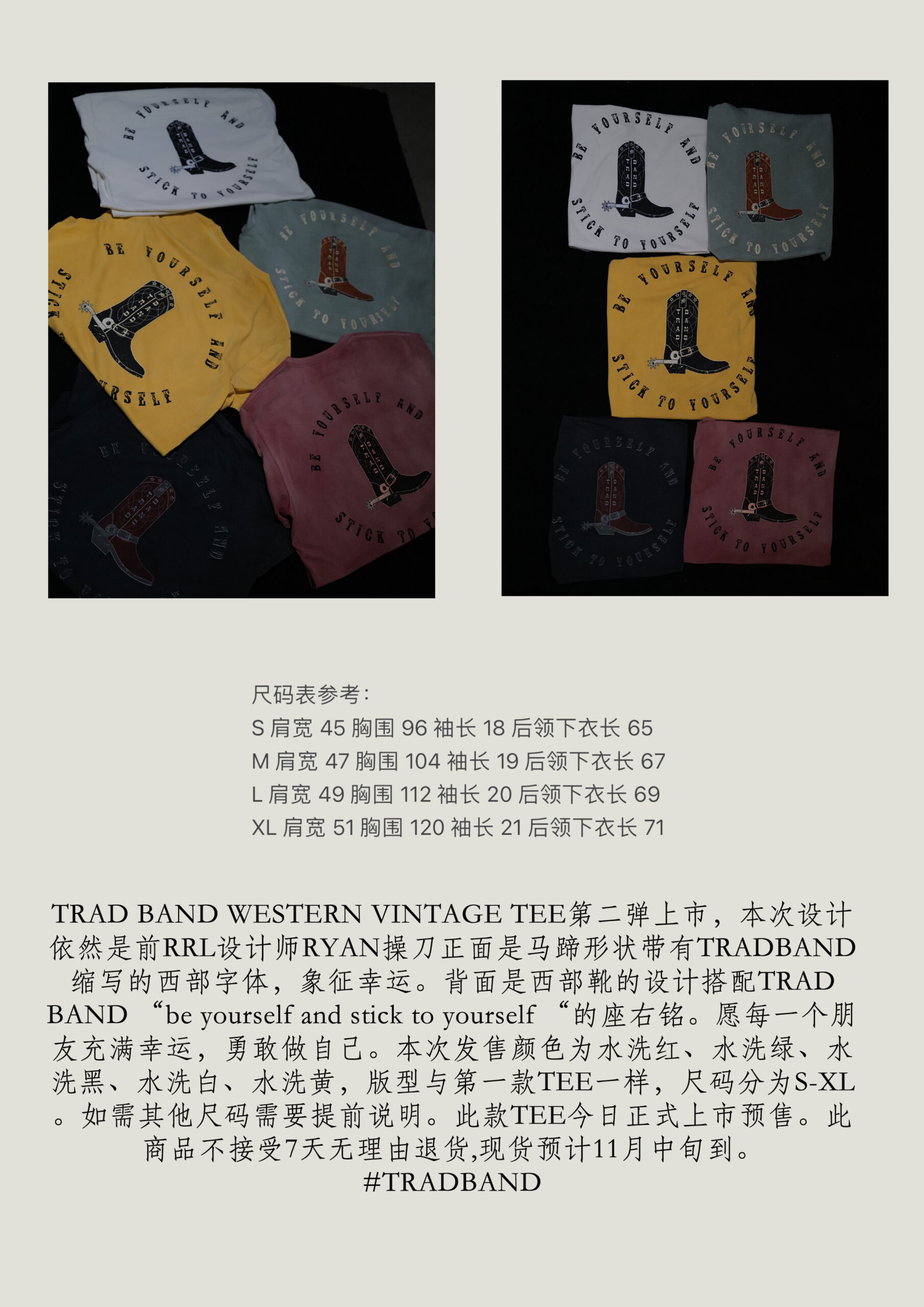 第二批 TRAD BAND WESTERN VINTAGE TEE 已上市。这个设计仍然是前 RRL 设计师 Ryan 的。正面是马蹄形的西式字体,缩写为 TRADBAND,象征着好运。背面是西部靴设计,印有 TRADBAND 的座右铭“做你自己,坚持自己”。愿每个朋友都充满运气,勇敢做自己。这次出售的颜色是水洗红、水洗绿、水洗黑、水洗白和水洗黄。款式与第一张TEE相同,尺码分为S-XL如需其他尺码,请提前告知。这款 TEE 今天正式发售。本商品不接受 7 天无条件退换货,现货预计 11 月中旬到货。#TRADBAND