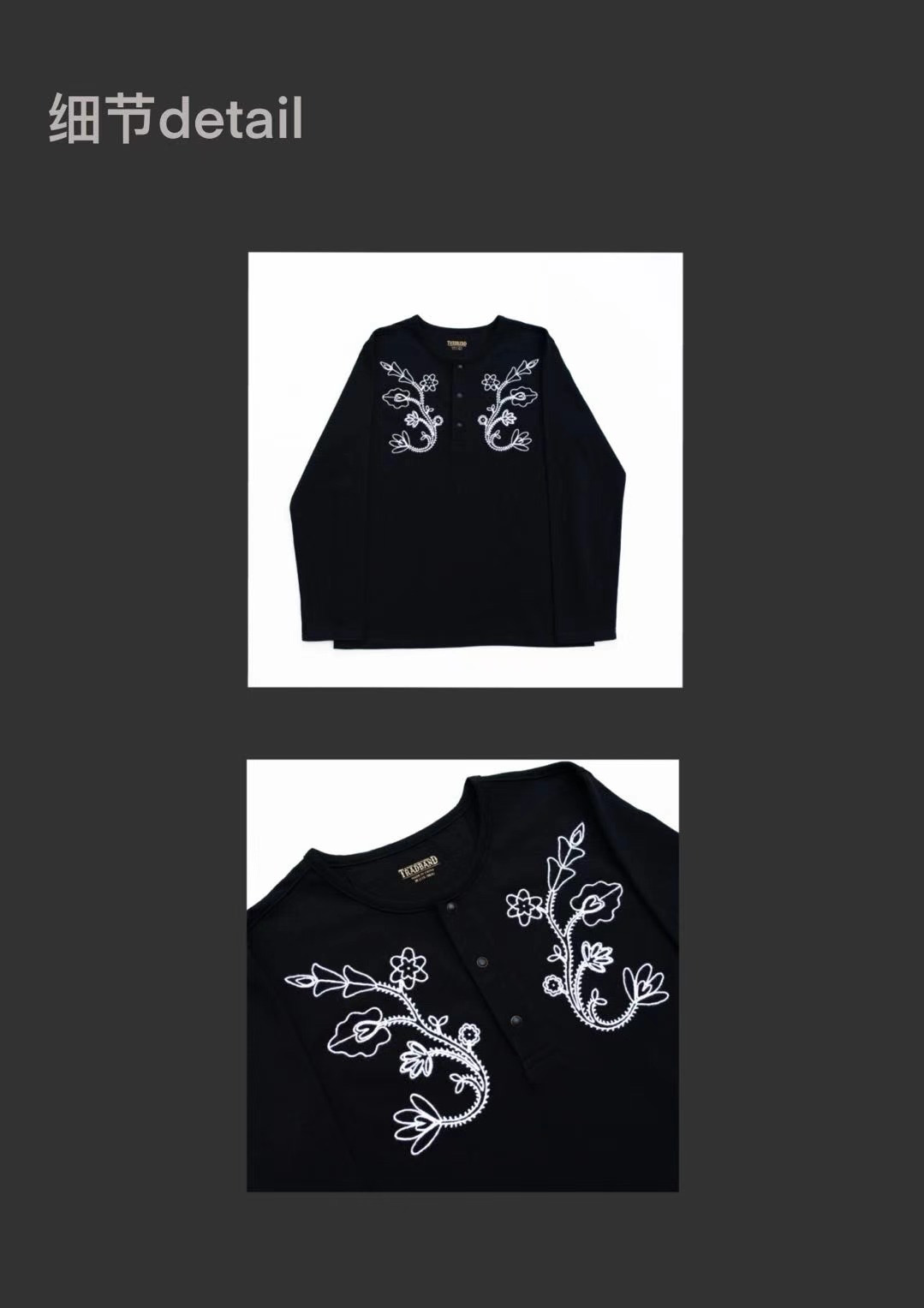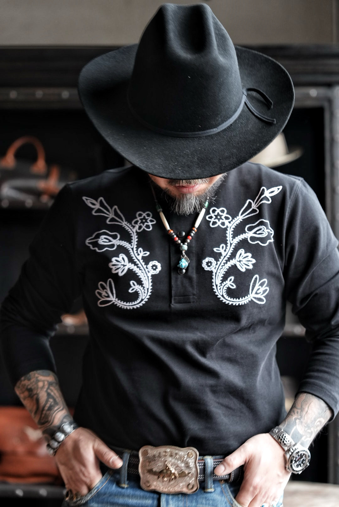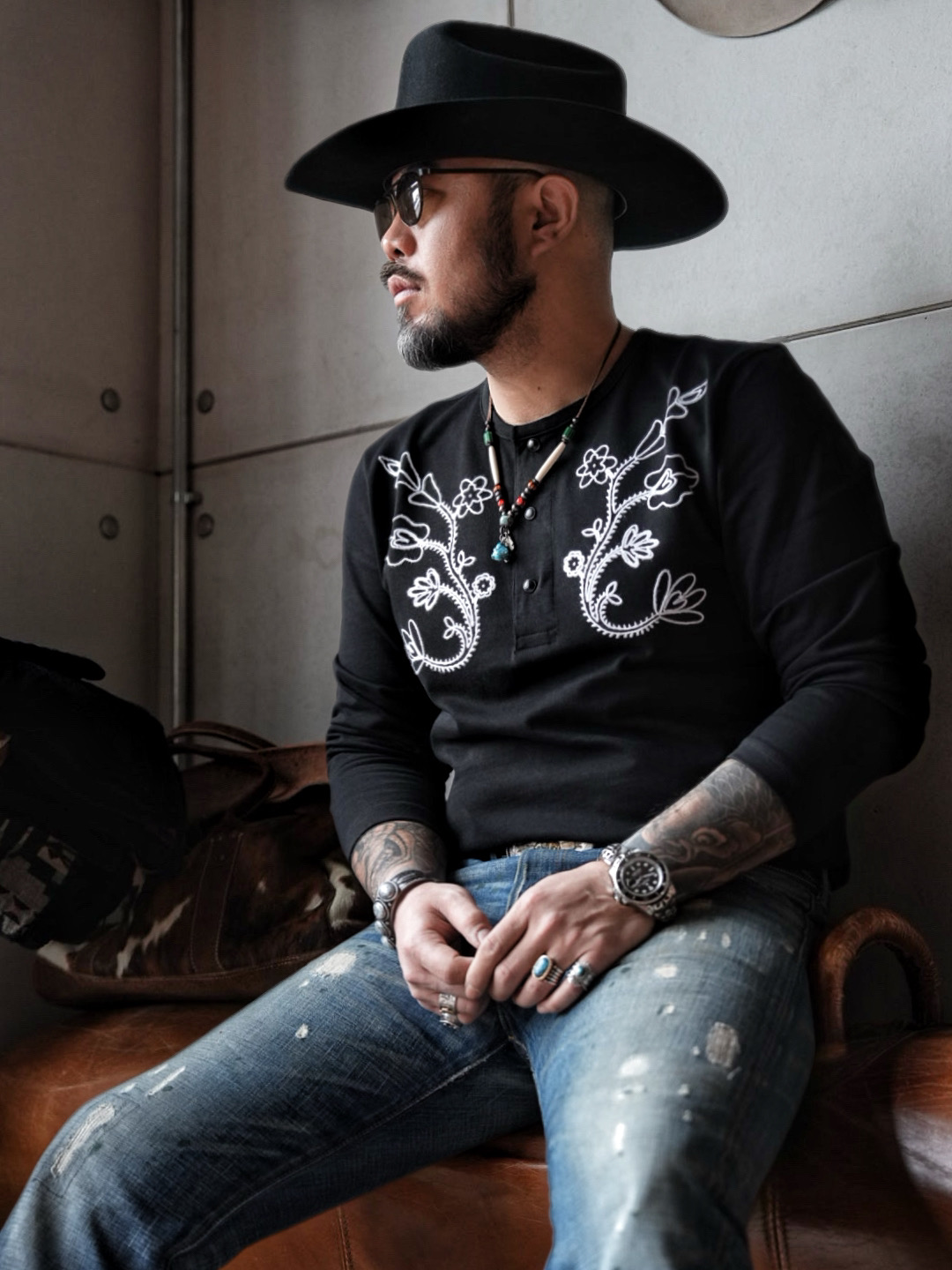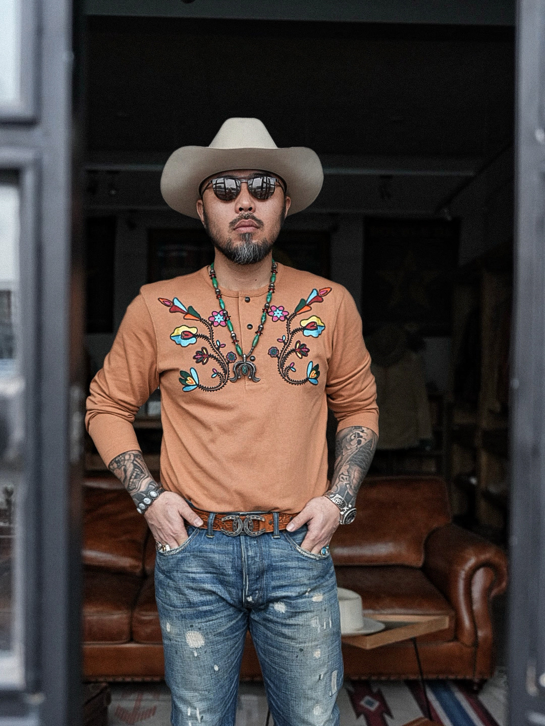 TRADBAND Limited edition western musicians embroidered 3 color henley shirt vintage long sleeve denim knit