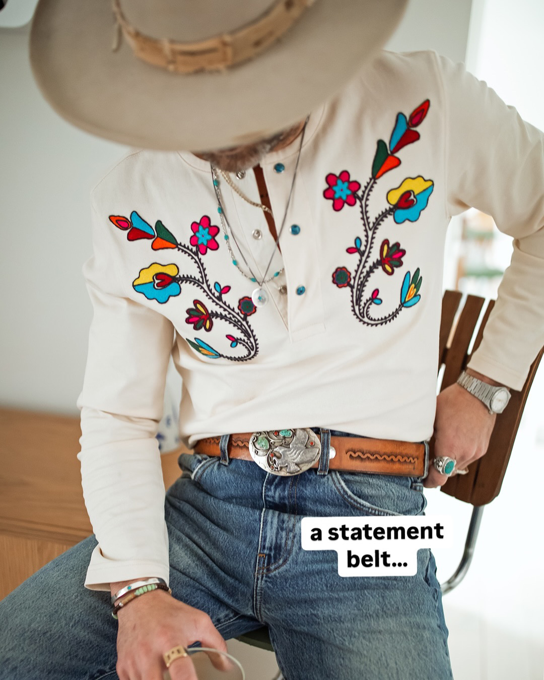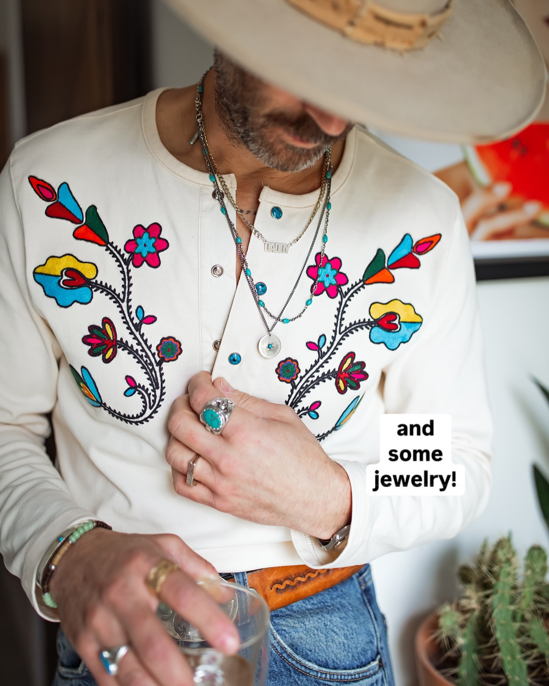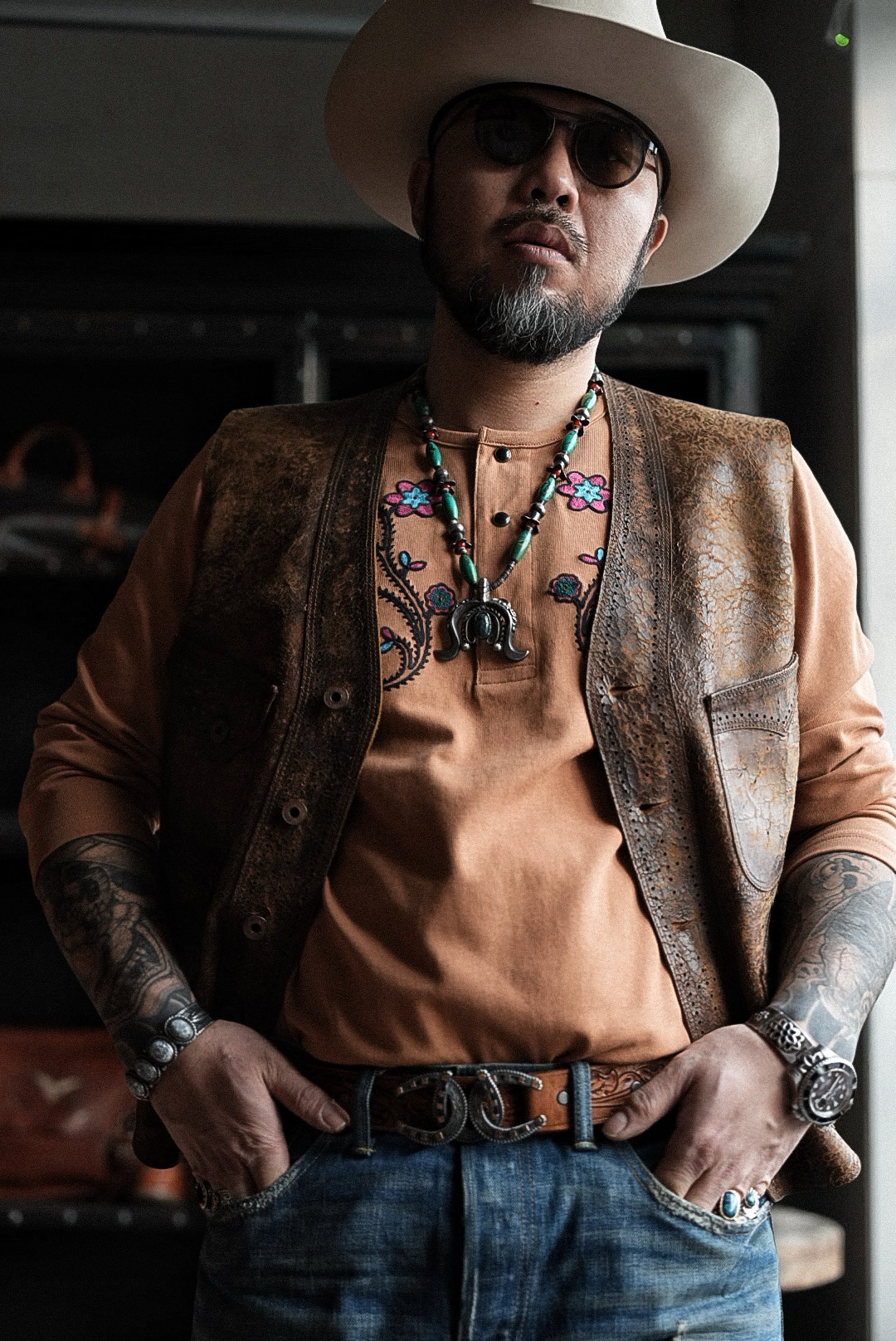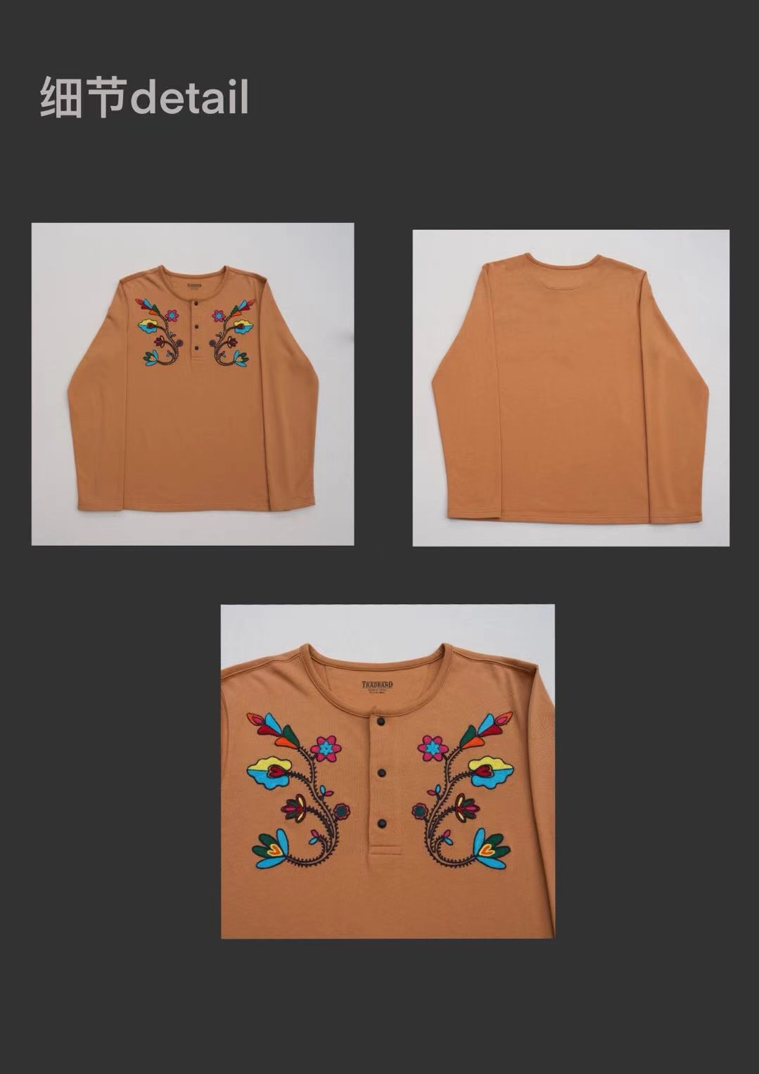 TRADBAND Limited edition western musicians embroidered 3 color henley shirt vintage long sleeve denim knit