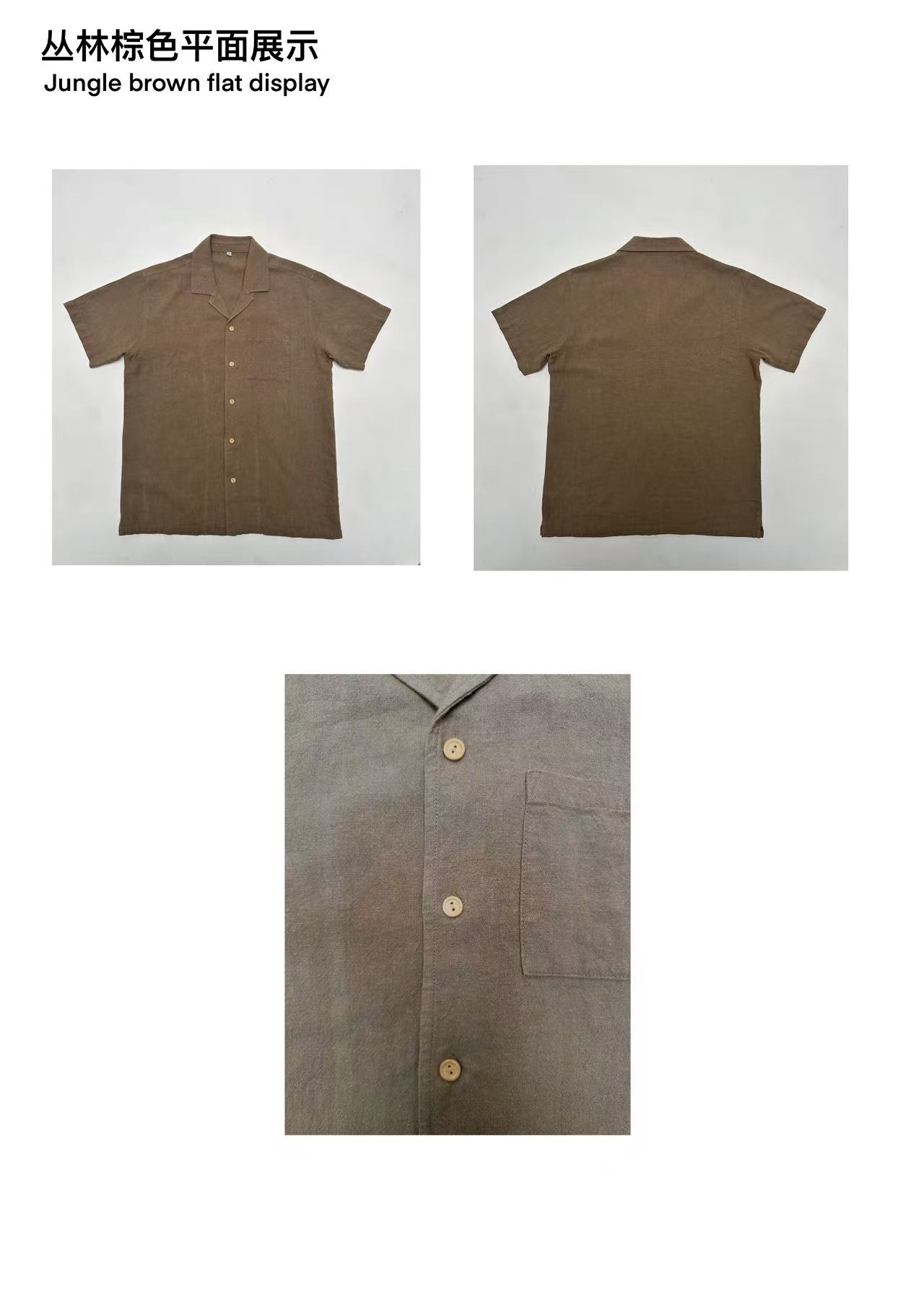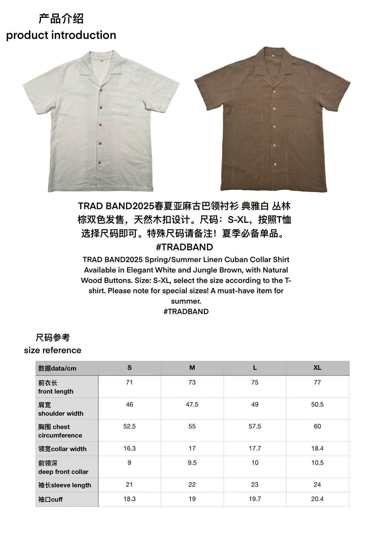 TRAD BAND2025 春夏亚麻古巴领衬衫有优雅的白色和丛林棕色可供选择,搭配天然木质纽扣。尺码:S-XL,根据 T 恤选择尺码。夏天的必备单品。